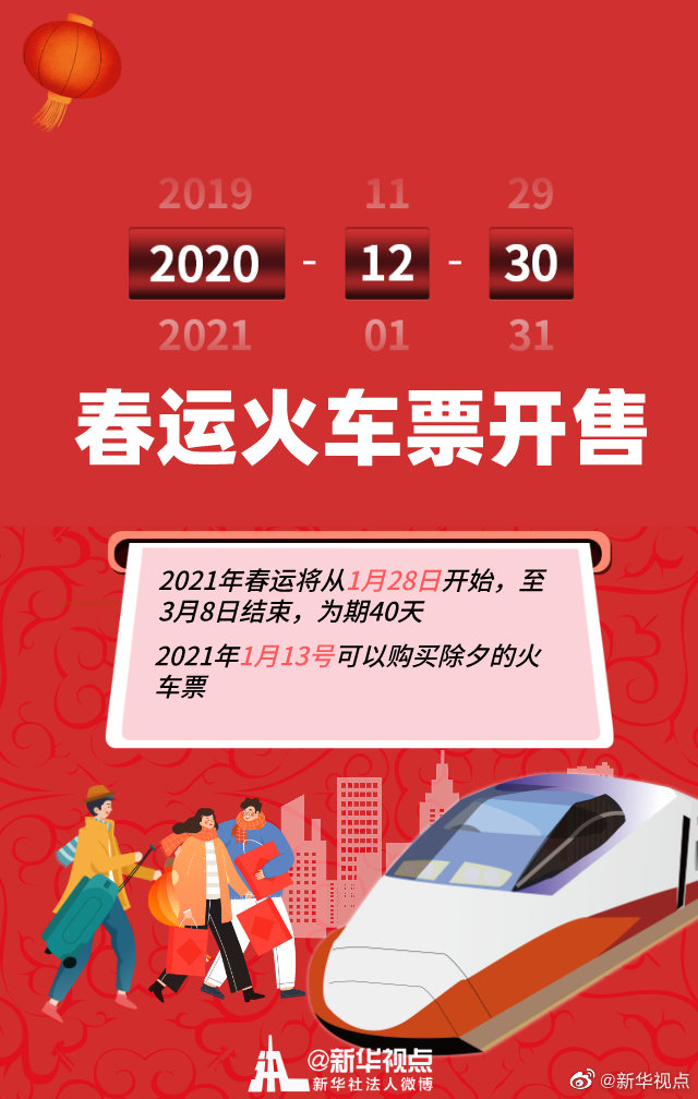 12月30日,2021年春運火車票正式開始發(fā)售。2021年春運將從1月28日開始,至3月8日結束,為期40天。不知道你做好出行計劃了嗎?說到買票,讓小編為你敲重點:1月13日前后可以購買除夕前后的火車票;想安安靜靜旅行,你可以選擇靜音車廂;票沒搶到,你可以通過“候補購票”功能試試運氣??紤]疫情原因,建議有條件的旅客錯峰出行,避開春運高峰期,出行時做好防護措施,全程佩戴口罩。(記者 樊曦 周圓)
