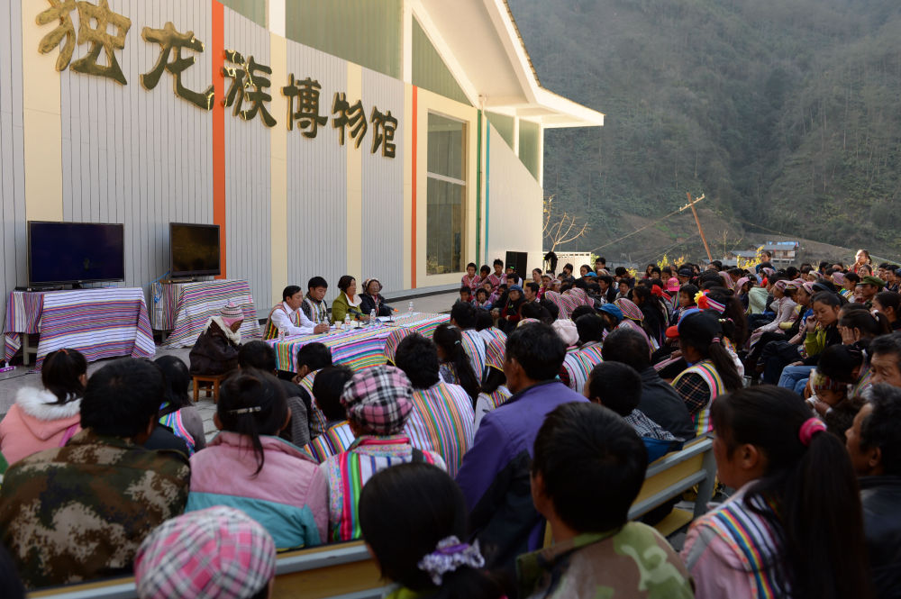 受到習(xí)近平總書記會(huì)見的貢山縣干部群眾代表回到獨(dú)龍江鄉(xiāng),在新修起的獨(dú)龍族博物館前用漢語(yǔ)和獨(dú)龍語(yǔ)向數(shù)百名獨(dú)龍族群眾宣講總書記的講話內(nèi)容(2015年1月22日攝)。新華社記者 胡超 攝
