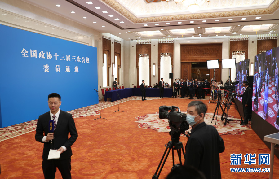 ??? 全國政協十三屆三次會議首場“委員通道”采訪活動于5月21日在人民大會堂新聞發(fā)布廳舉行,邀請部分全國政協委員通過網絡視頻方式接受媒體采訪。圖為