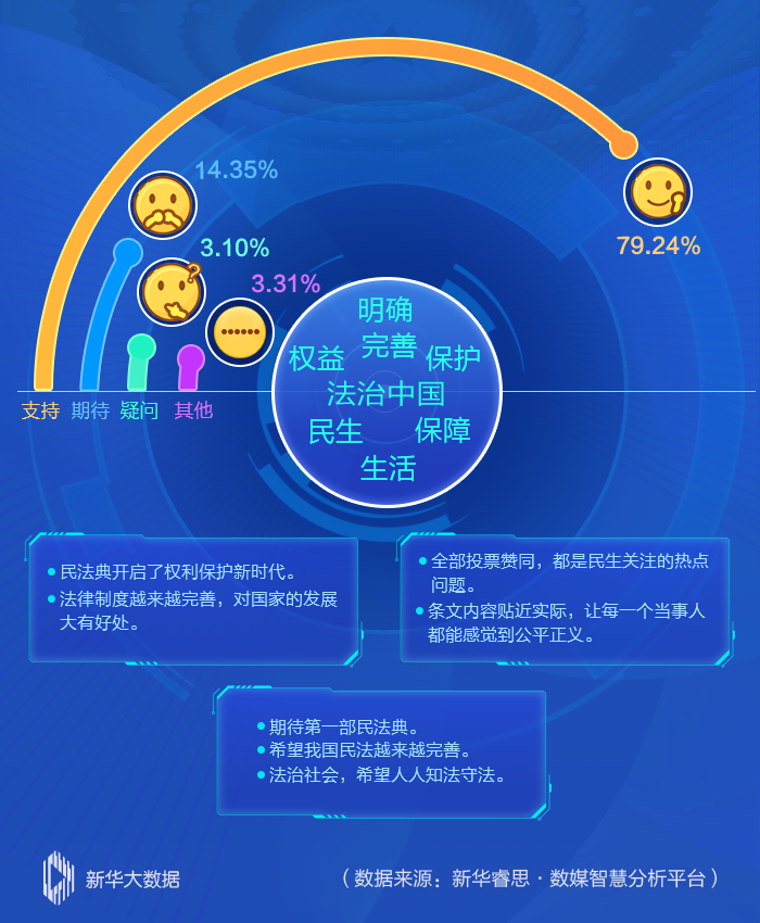 新華睿思數(shù)據(jù)顯示,近八成網(wǎng)民對(duì)民法典草案表示支持和肯定,認(rèn)為“民法典開(kāi)啟了權(quán)利保護(hù)新時(shí)代”“法治中國(guó)給老百姓帶來(lái)實(shí)實(shí)在在的好處”。從話題熱詞分析來(lái)看,“法治中國(guó)”“完善”“保護(hù)”三大熱詞有效地呼應(yīng)了編纂民法典的出發(fā)點(diǎn)和落腳點(diǎn)。