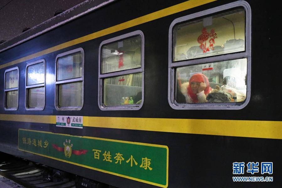 2020年1月10日,由蘭州開往武威南的7505次列車??吭谟赖钦?,一名旅客望向窗外。由甘肅蘭州開往武威南的7505次列車是一列老式綠皮車,串聯(lián)起蘭州和武威兩座城市之間的十幾座小站。因?yàn)槠眱r(jià)便宜、乘坐方便,它成為沿線鄉(xiāng)村群眾進(jìn)城購物、售賣農(nóng)產(chǎn)品、探親訪友、外出打工的首選交通工具。