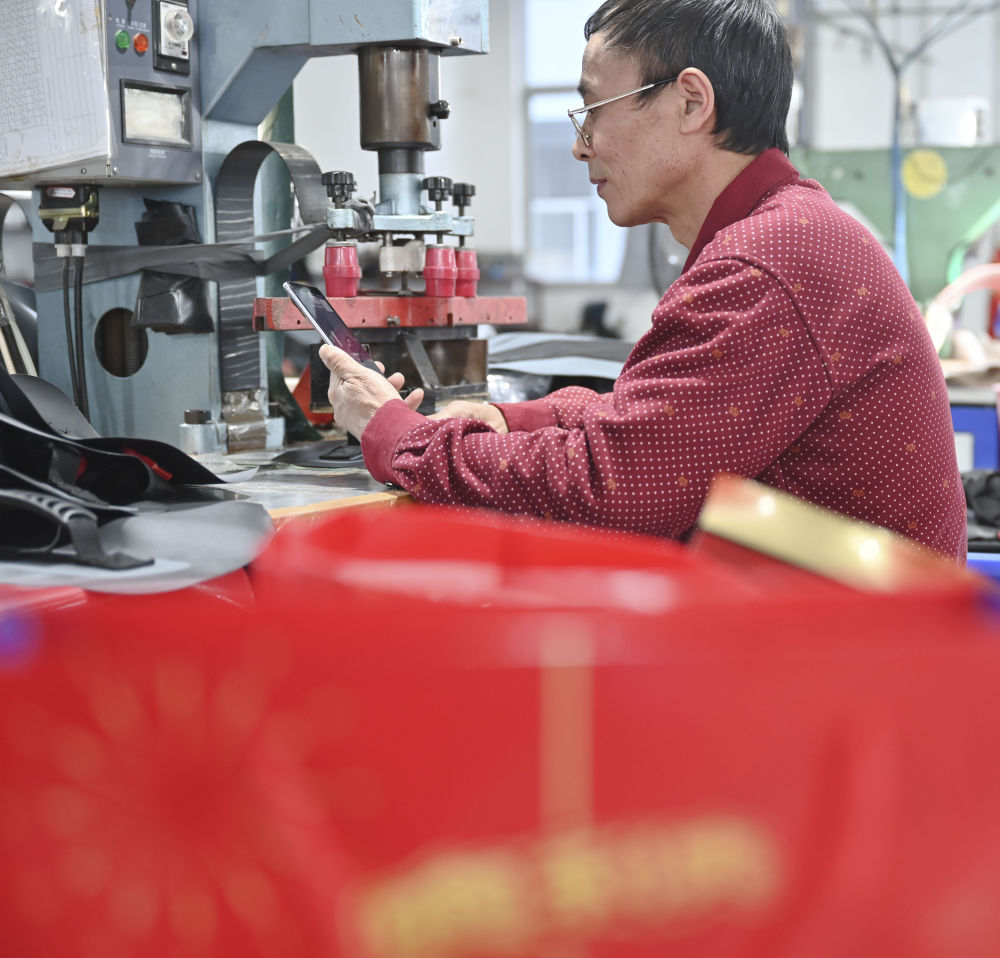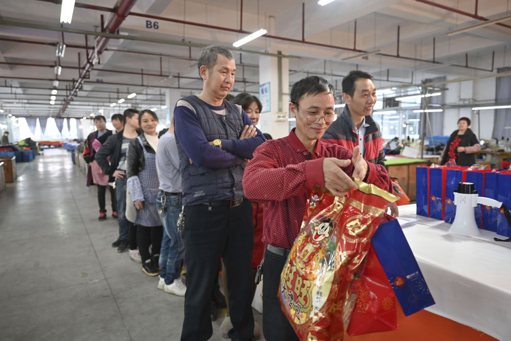 在工廠工作了十多年的張良國將領到的年貨拍成照片,發(fā)給遠在四川老家的兒子,告訴家人這里一切都好。