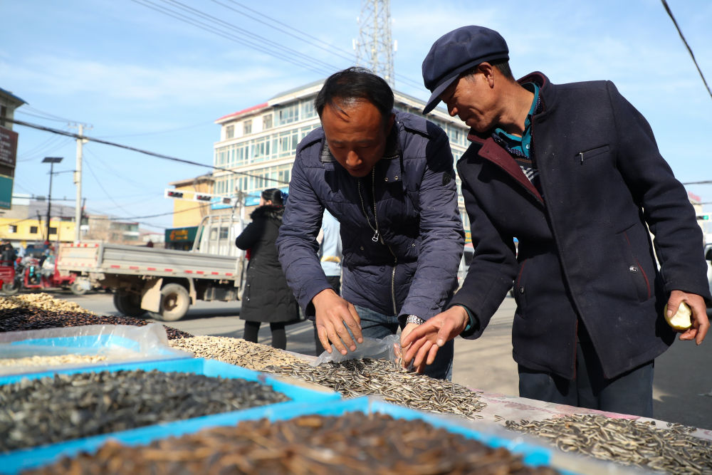 2月7日,在甘肅省定西市渭源縣會(huì)川鎮(zhèn)集市上,元古堆村村民曾玉成(右)在置辦年貨。新華社記者 馬希平 攝