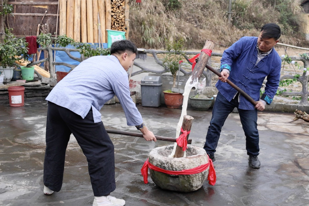 2月3日,在湖南省湘西土家族苗族自治州花垣縣十八洞村,村民在打糍粑,儲(chǔ)備過年物資。新華社記者 陳思汗 攝