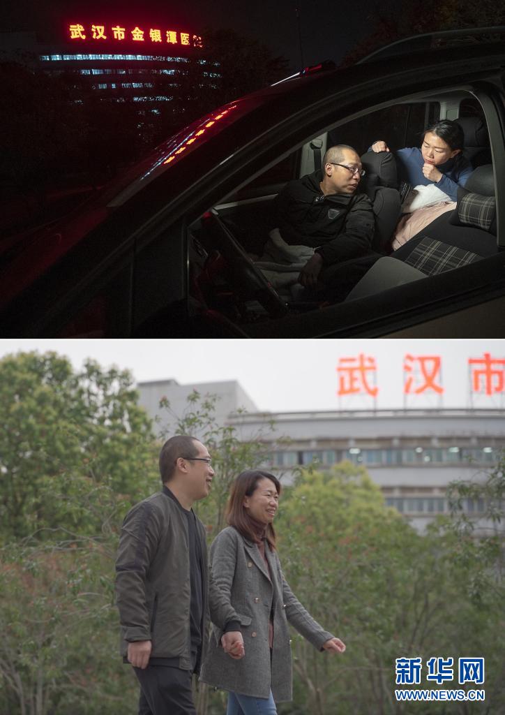這是一張拼版照片,上圖為:2020年2月22日晚,武漢市金銀潭醫(yī)院的醫(yī)護(hù)夫妻涂盛錦(左)與曹珊在車內(nèi)聊天。從大年初一開始,兩人就住進(jìn)車?yán)?,為在疫情中搶救病患,爭分奪秒,以車為家;下圖為:3月23日,武漢市金銀潭醫(yī)院的醫(yī)護(hù)夫妻涂盛錦和曹珊在下班路上。新華社記者 熊琦 攝