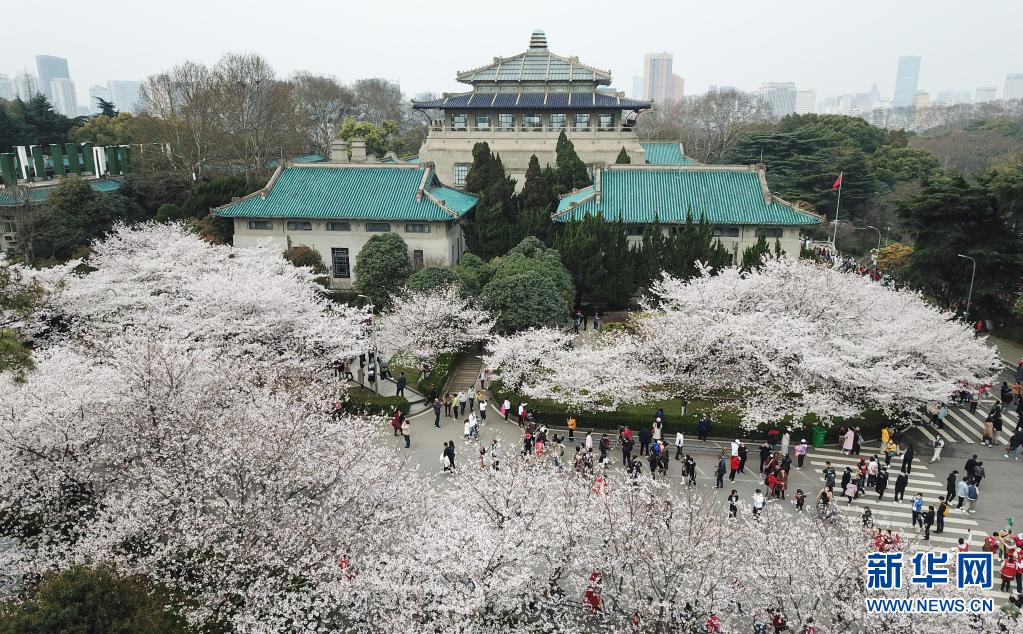 3月13日,武漢大學(xué)抗疫醫(yī)護(hù)人員賞櫻專場啟動,來自全國各地的援鄂抗疫英雄在櫻花樹下重逢,盡享櫻花之約(無人機照片)。新華社記者 程敏 攝