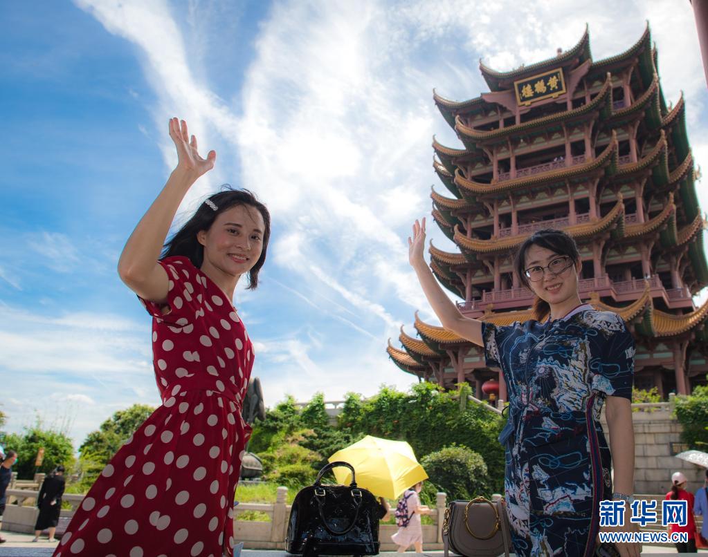 2020年8月7日,受邀來湖北旅游的海南援鄂醫(yī)療隊員陳小妹(左)與同事計超在黃鶴樓景區(qū)觀光。湖北省組織“與愛同行 惠游湖北”活動,陸續(xù)邀請援鄂醫(yī)護(hù)人員代表以及湖北醫(yī)護(hù)人員、社區(qū)工作者、志愿者等走進(jìn)景區(qū),飽覽荊楚風(fēng)貌。新華社記者 肖藝九 攝