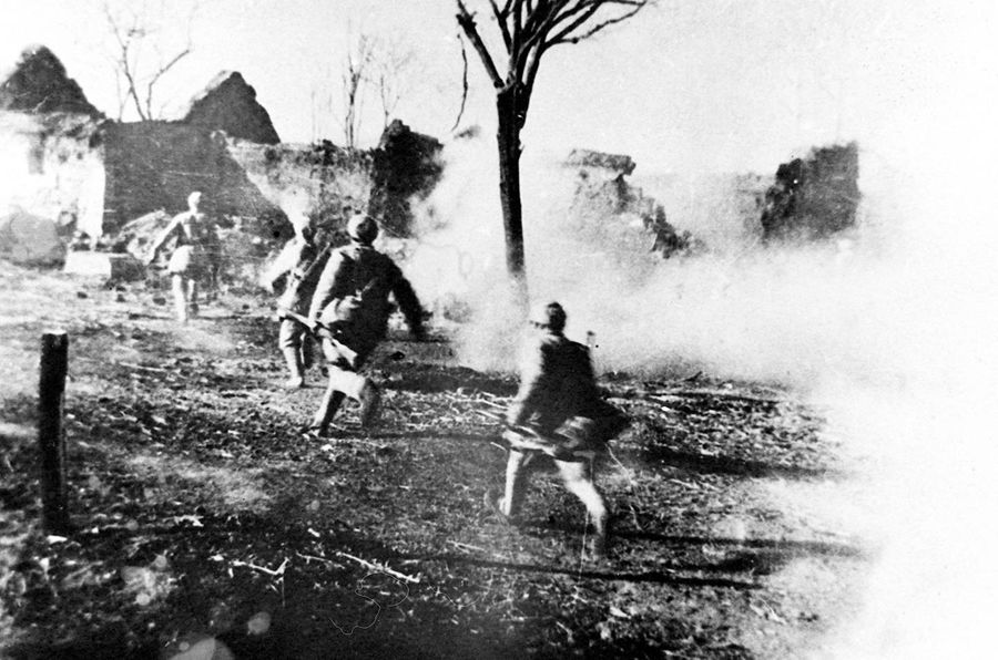 在淮海戰(zhàn)役中,人民解放軍突破濃煙密火,撲向國民黨軍的指揮所魯樓。 新華社圖片