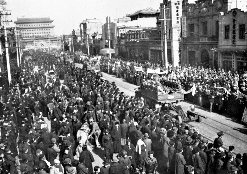 北平市民在正陽門大街上夾道歡迎參加入城式的人民解放軍。 新華社圖片