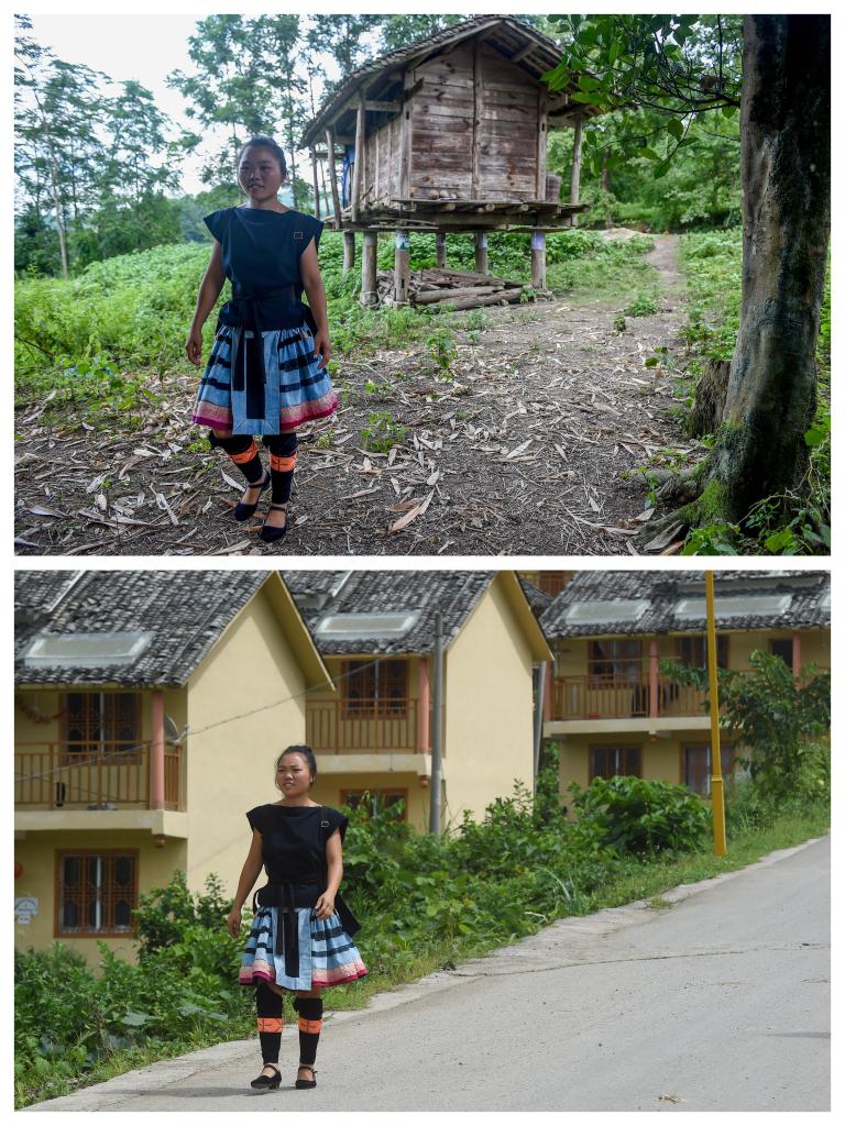 拼版照片:上圖為貴州黔南布依族苗族自治州荔波縣瑤山瑤族鄉(xiāng)村民謝三英從舊居的小路旁經(jīng)過(guò),下圖為謝三英從瑤山瑤族鄉(xiāng)拉片移民新村的公路旁經(jīng)過(guò)(2017年8月8日攝)。新華社記者歐東衢攝