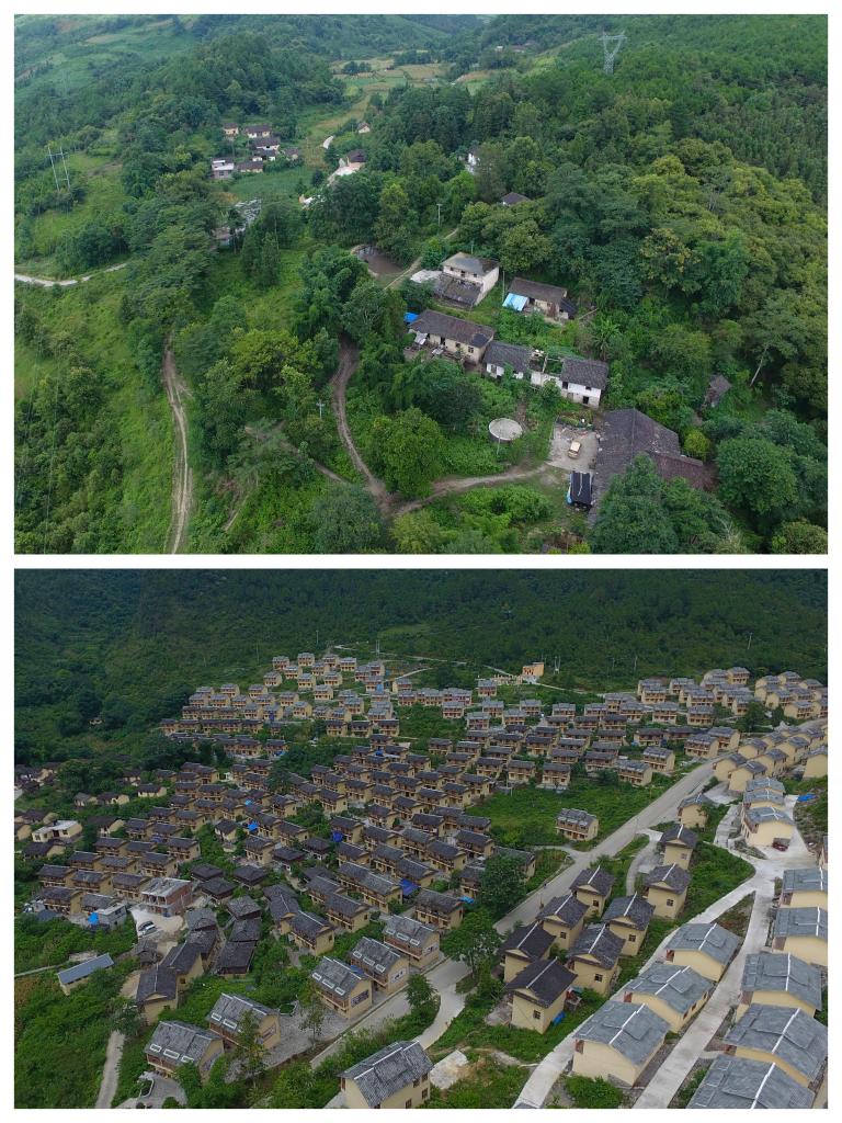拼版照片:上圖為貴州省荔波縣瑤山瑤族鄉(xiāng)村民此前居住的拉片村林場(chǎng)組全景,下圖為瑤山瑤族鄉(xiāng)拉片移民新村全景(2017年8月8日攝)。新華社記者歐東衢攝