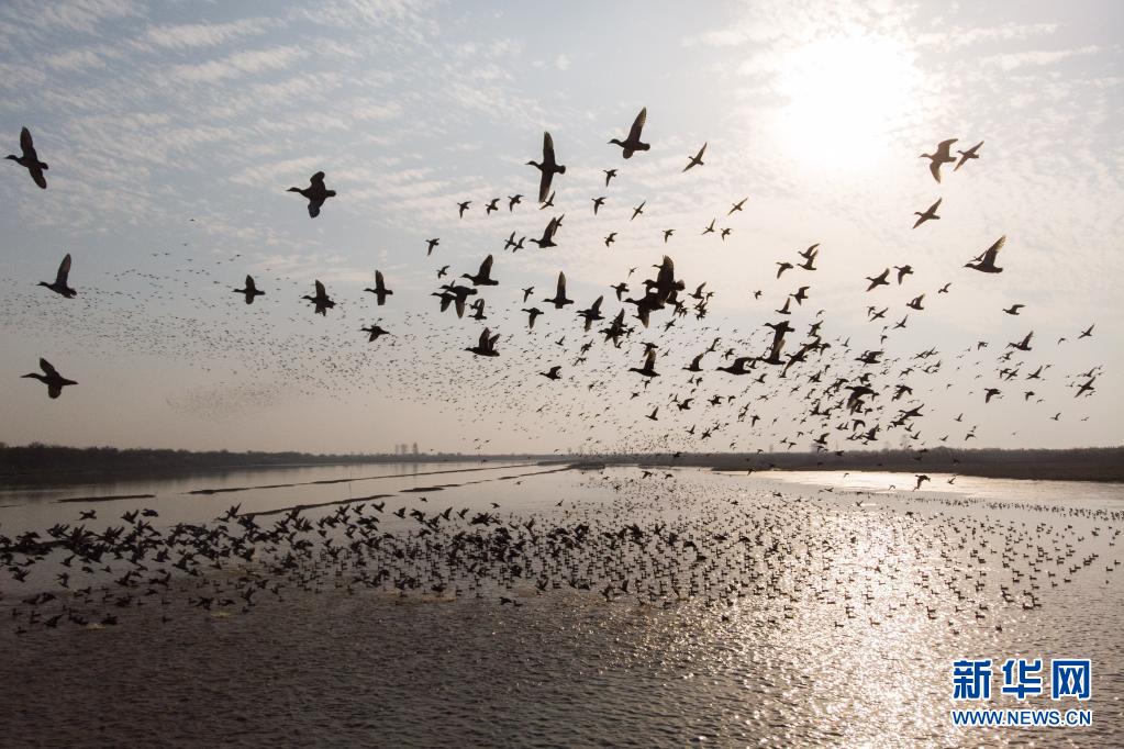 成群羅紋鴨在湖南西洞庭湖國家級自然保護(hù)區(qū)飛翔(2020年11月11日攝,無人機(jī)照片)。新華社記者 陳思汗 攝