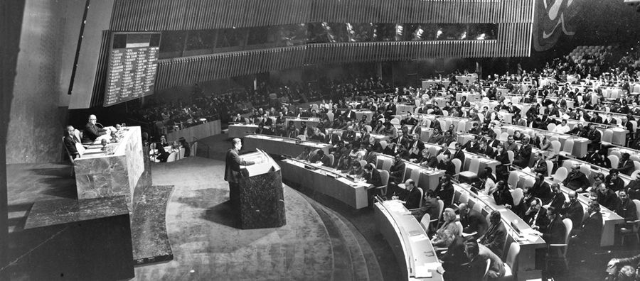 1971年9月,第二十六屆聯(lián)合國大會召開。從10月18日開始,聯(lián)合國大會就恢復(fù)中華人民共和國在聯(lián)合國的代表權(quán)問題進行了一周的激烈辯論。10月25日,第二十六屆聯(lián)合國大會表決剛一結(jié)束,紐約聯(lián)合國會議大廳里立刻一片沸騰,雷鳴般的掌聲和歡呼聲一浪高過一浪,此起彼伏,經(jīng)久不息。新聞媒介評論道:“中國是在自己不在場的情況下,受到聯(lián)大三分之二以上國家的祝福,使聯(lián)合國發(fā)生根本變化?!?/p>