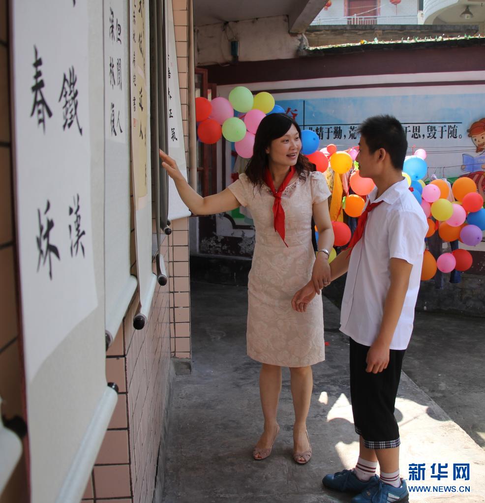 田艷(左)在貴州省印江縣特殊教育學(xué)校觀看孩子們的書(shū)畫(huà)作品(2016年6月1日攝)。新華社發(fā)