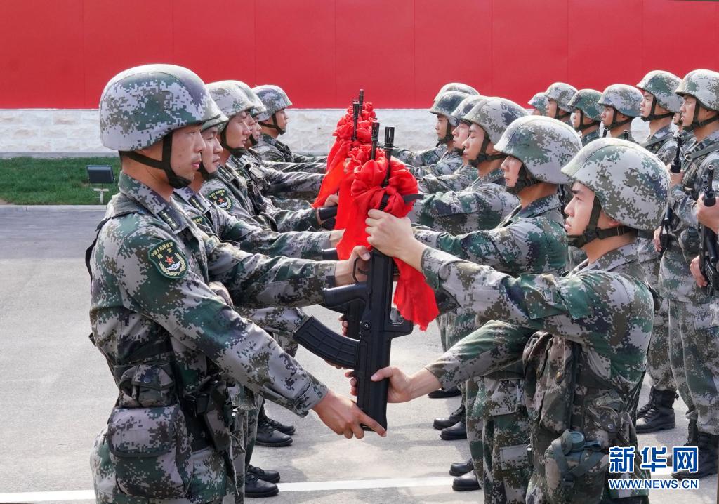 陸軍第83集團軍某旅“紅一連”黨支部為新戰(zhàn)士舉行授槍儀式(7月4日攝)。新華社記者 張永進 攝