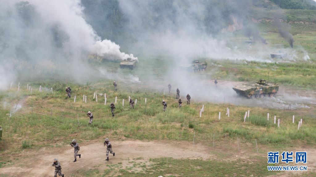 對抗演練中,陸軍第83集團軍某旅“紅一連”官兵突破“敵”陣地前沿(無人機照片,7月4日攝)。新華社發(fā)(姜東坡攝)
