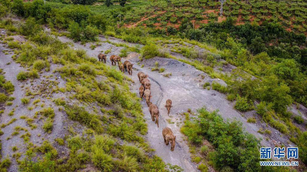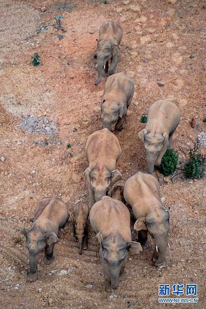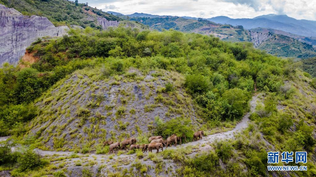 這是5月28日在云南省玉溪市峨山縣境內(nèi)拍攝的象群(無人機(jī)照片)。新華社記者 胡超 攝