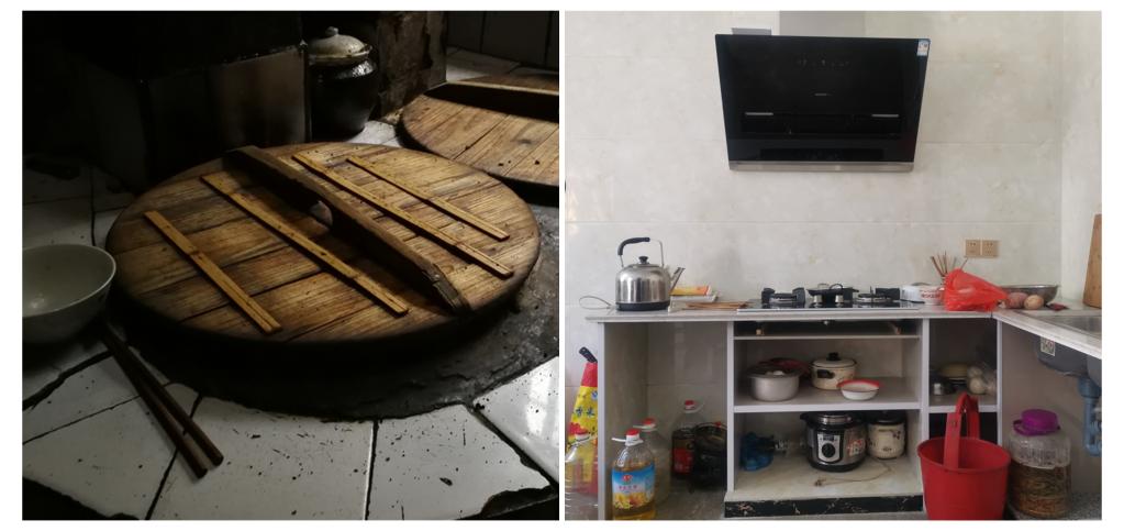 拼版照片:左圖為2017年8月29日,記者在一戶農(nóng)家中拍攝的土灶臺(tái)。
