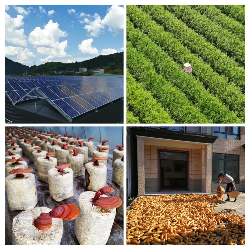 拼版照片:左上圖為大灣村中的光伏電站。左下圖為光伏板下種植的靈芝。