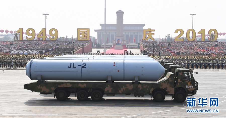 10月1日上午,慶祝中華人民共和國成立70周年大會在北京天安門廣場隆重舉行。這是巨浪-2導(dǎo)彈方隊接受檢閱。 新華社記者 高潔 攝