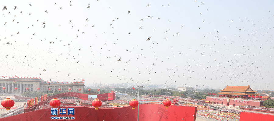 10月1日上午,慶祝中華人民共和國成立70周年大會(huì)在北京天安門廣場隆重舉行。這是天安門廣場上放飛和平鴿。 新華社記者 金立旺 攝
