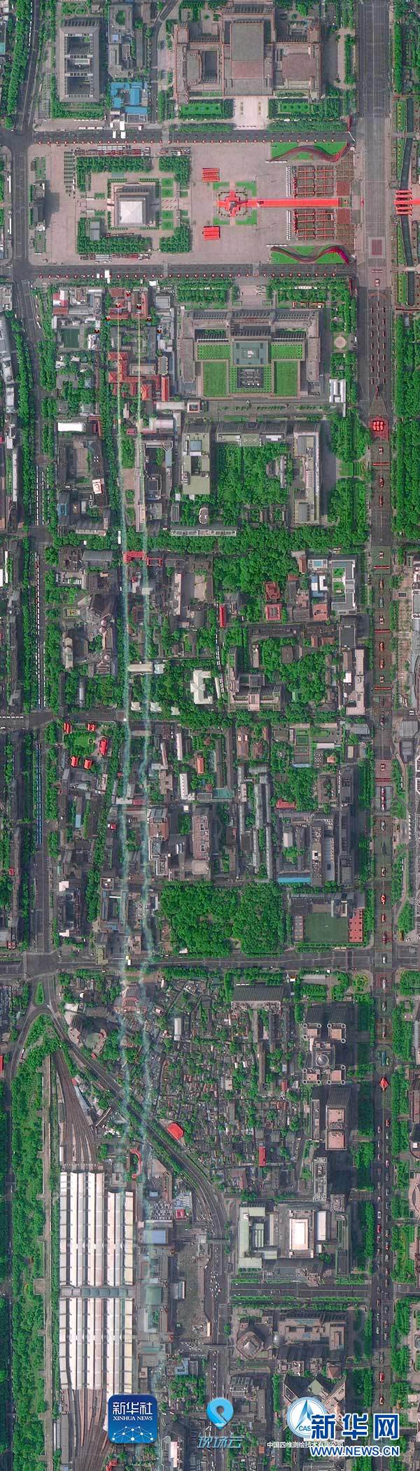 這是“高景1號(hào)”拍攝的拉出彩煙的空中梯隊(duì)即將通過天安門廣場上空(10月1日攝)。 10月1日上午,慶祝中華人民共和國成立70周年大會(huì)在北京天安門廣場隆重舉行。新華社聯(lián)合多家單位調(diào)用多顆國產(chǎn)衛(wèi)星俯瞰閱兵,從“最高機(jī)位”發(fā)回這三張珍貴的長安街全畫幅衛(wèi)星圖。 新華社發(fā)(中國四維測繪技術(shù)有限公司提供)