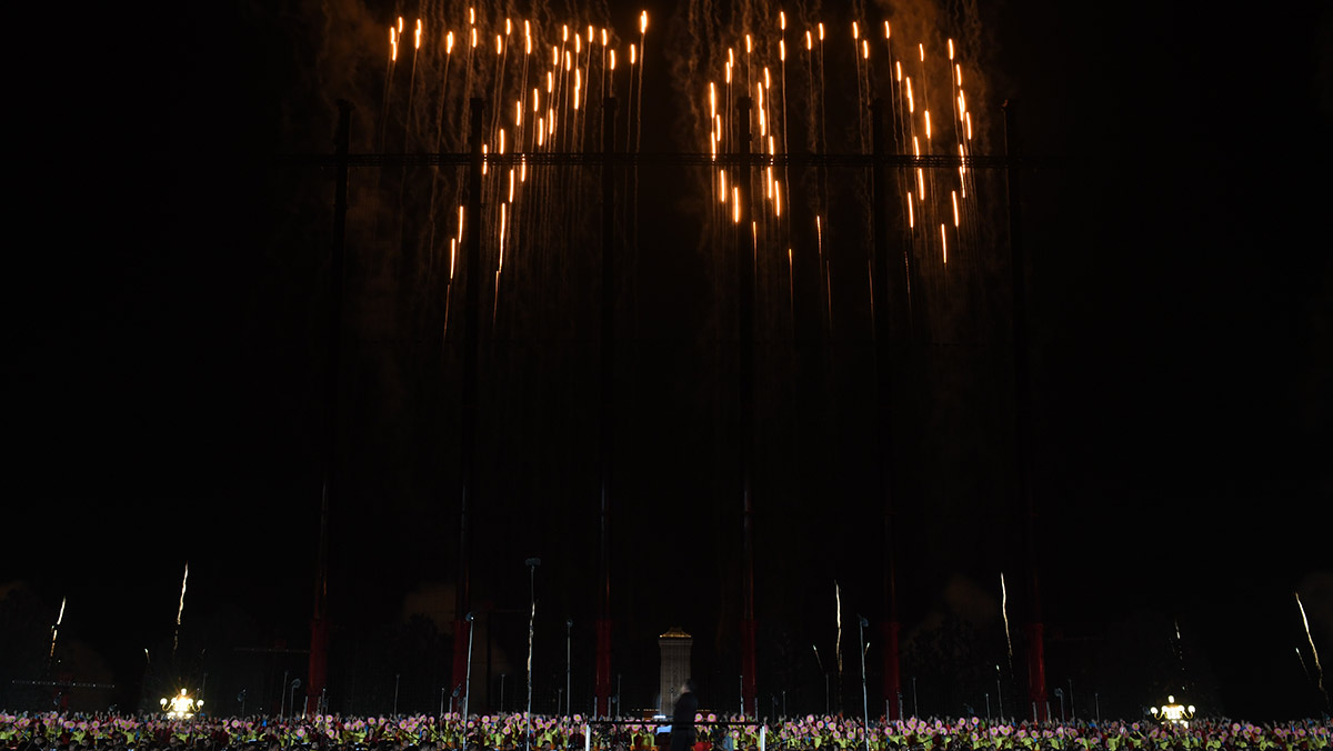 聯(lián)歡活動(dòng)分“紅旗頌”“我們走在大路上”“在希望的田野上”“領(lǐng)航新時(shí)代”4個(gè)篇章,由主題表演、中心聯(lián)歡表演、群眾聯(lián)歡和煙花表演組成
