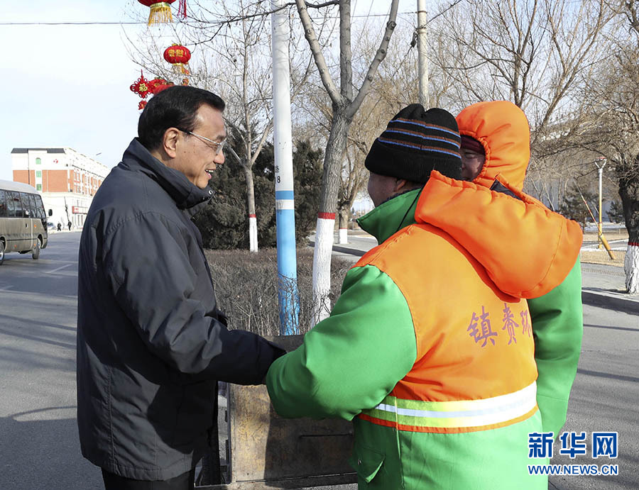 2月12日至13日,中共中央政治局常委、國務(wù)院總理李克強(qiáng)在吉林省白城市鎮(zhèn)賚縣考察。 這是2月12日,李克強(qiáng)在鎮(zhèn)賚縣同環(huán)衛(wèi)工人握手交流。新華社記者 龐興雷 攝