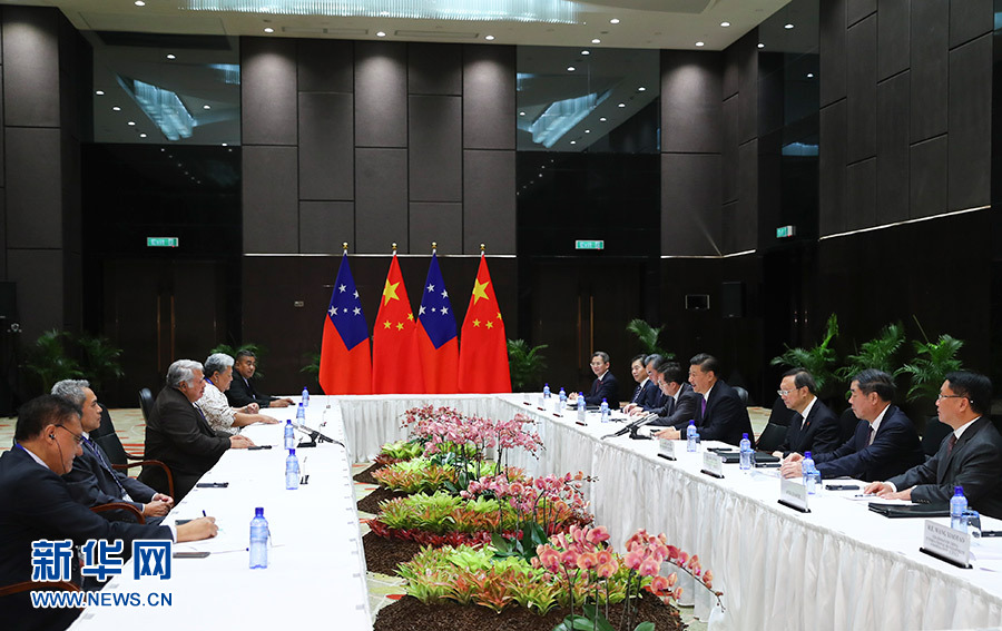 11月16日,國(guó)家主席習(xí)近平在莫爾茲比港分別會(huì)見建交太平洋島國(guó)領(lǐng)導(dǎo)人。這是習(xí)近平會(huì)見薩摩亞總理圖伊拉埃帕。 新華社記者 謝環(huán)馳 攝