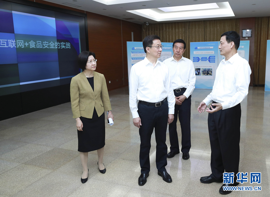 6月13日,在2019年全國食品安全宣傳周活動前夕,中共中央政治局常委、國務(wù)院副總理、國務(wù)院食品安全委員會主任韓正到國務(wù)院食品安全委員會辦公室主持召開座談會,聽取對食品安全工作的意見建議。這是會前,韓正參觀食品安全工作情況展示,考察了解食品安全智慧監(jiān)管的創(chuàng)新舉措。 新華社記者 龐興雷 攝