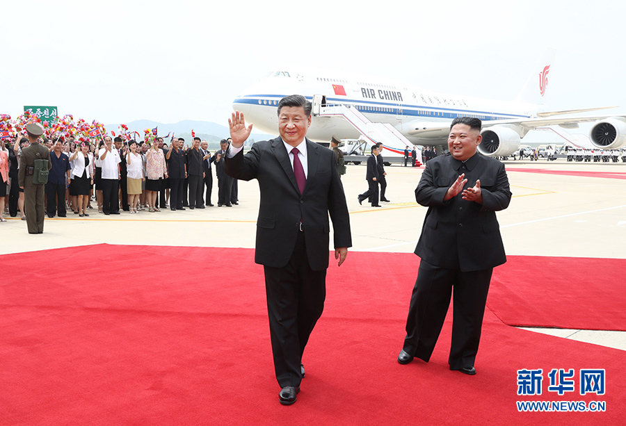 在朝鮮群眾浪潮般的歡呼聲中,習近平和夫人彭麗媛步出艙門,金正恩和夫人李雪主在舷梯旁熱情迎接。習近平走下舷梯,同金正恩親切握手問候。朝鮮兒童向習近平和彭麗媛獻上鮮花。習近平主席并同前來迎接的朝方高級官員一一握手致意。