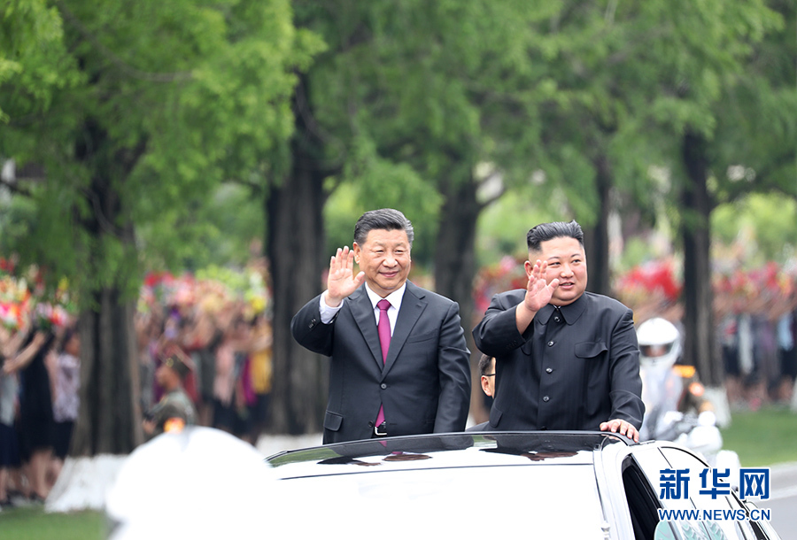 6月20日,中共中央總書記、國家主席習近平乘專機抵達平壤,開始對朝鮮民主主義人民共和國進行國事訪問。朝鮮勞動黨委員長、國務委員會委員長金正恩和夫人李雪主到機場熱情迎接習近平和夫人彭麗媛。朝方在機場舉行隆重歡迎儀式。歡迎儀式結束后,習近平與金正恩同車前往錦繡山太陽宮廣場,沿途數(shù)十萬群眾夾道歡迎。 新華社記者 申宏 攝
