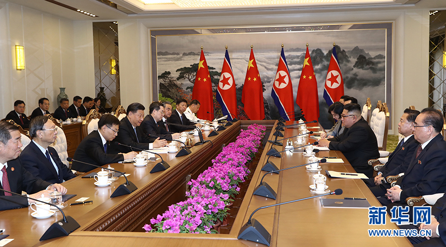 習(xí)近平指出,去年以來,我和委員長同志4次會(huì)晤,書寫了中朝關(guān)系新篇章,并結(jié)下了深厚友誼。感謝金正恩委員長同志為我這次訪問舉行的隆重而熱烈的歡迎儀式,我今天從下飛機(jī)到抵達(dá)住處,所到之處無不感受到中朝一家親的濃厚氛圍。今年是中朝建交70周年,在兩黨兩國關(guān)系發(fā)展史上具有承前啟后、繼往開來的重要意義,我又同金正恩委員長在平壤會(huì)面。我這次是為鞏固傳承中朝友誼而來,為推動(dòng)朝鮮半島問題政治解決進(jìn)程而來。相信以這次訪問為契機(jī),我們一定會(huì)共同擘畫中朝關(guān)系美好未來,共同開啟中朝友誼嶄新篇章。