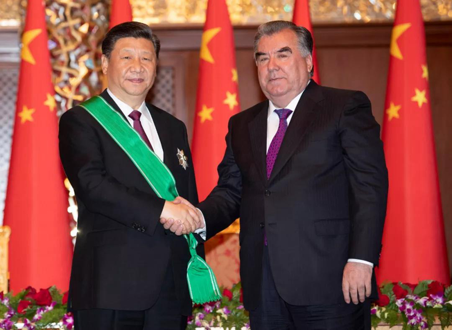 ↑熱恩別科夫總統(tǒng)和拉赫蒙總統(tǒng)分別向習(xí)主席授予各自國家最高獎(jiǎng)?wù)拢兄x習(xí)主席為發(fā)展吉中、塔中友誼所作的卓越貢獻(xiàn)。照片分別由新華社記者謝環(huán)馳、沙達(dá)提攝