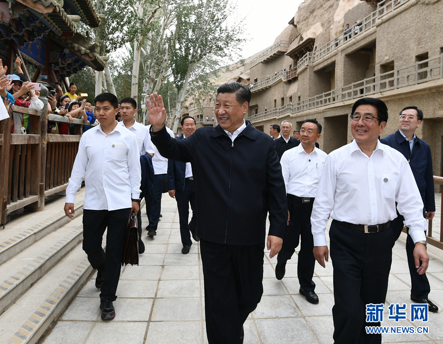 8月19日至22日,中共中央總書記、國家主席、中央軍委主席習(xí)近平在甘肅考察。這是19日下午,習(xí)近平在敦煌莫高窟考察調(diào)研時,向正在參觀的游客親切招手致意。 新華社記者 謝環(huán)馳 攝