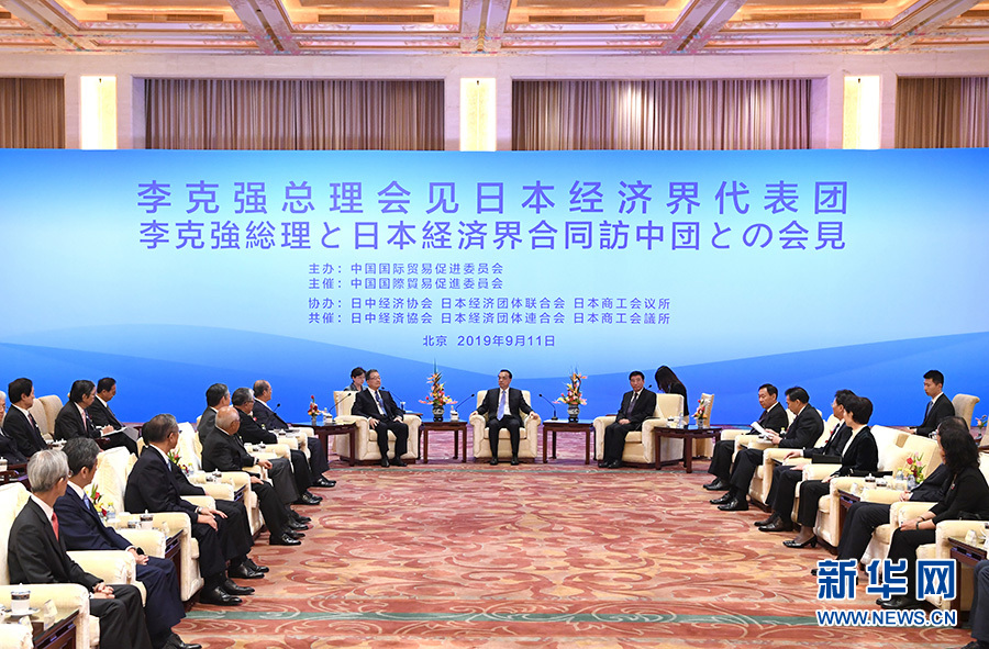 新華社北京9月11日電(記者朱超)國務院總理李克強11日下午在釣魚臺國賓館會見日中經(jīng)濟協(xié)會會長宗岡正二、日本商工會議所會長三村明夫、日本經(jīng)濟團體聯(lián)合會審議員會議長古賀信行率領(lǐng)的日本經(jīng)濟界代表團并同他們座談交流。日本主要企業(yè)負責人200余人出席。