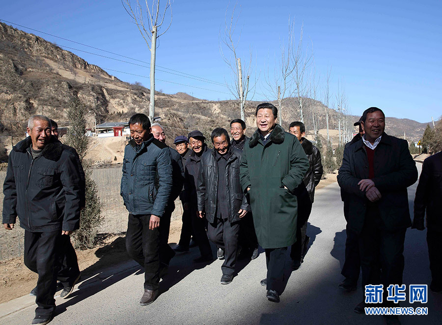 2015年2月13日,農(nóng)歷羊年春節(jié)來(lái)臨之際,習(xí)近平在陜西延安市延川縣文安驛鎮(zhèn)梁家河村調(diào)研時(shí)同村民邊走邊聊。新華社記者 蘭紅光 攝