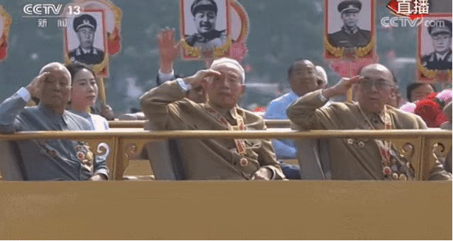 ?一曲《紅旗頌》奏響,當(dāng)“致敬方陣”的禮賓車上,老一輩黨和國家、軍隊(duì)領(lǐng)導(dǎo)人親屬代表,老一輩建設(shè)者和親屬代表,新中國成立前參加革命工作的老戰(zhàn)士,老一輩軍隊(duì)退役英模、民兵英模和支前模范代表等從天安門前經(jīng)過時(shí),全場所有人自發(fā)起立,向英雄們致以崇高的敬意?! ?