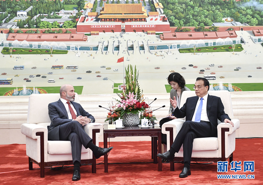 10月17日,國務(wù)院總理李克強(qiáng)在北京人民大會(huì)堂會(huì)見美中貿(mào)易全國委員會(huì)董事會(huì)主席格林伯格率領(lǐng)的訪華代表團(tuán)并同他們座談交流。新華社記者 殷博古 攝