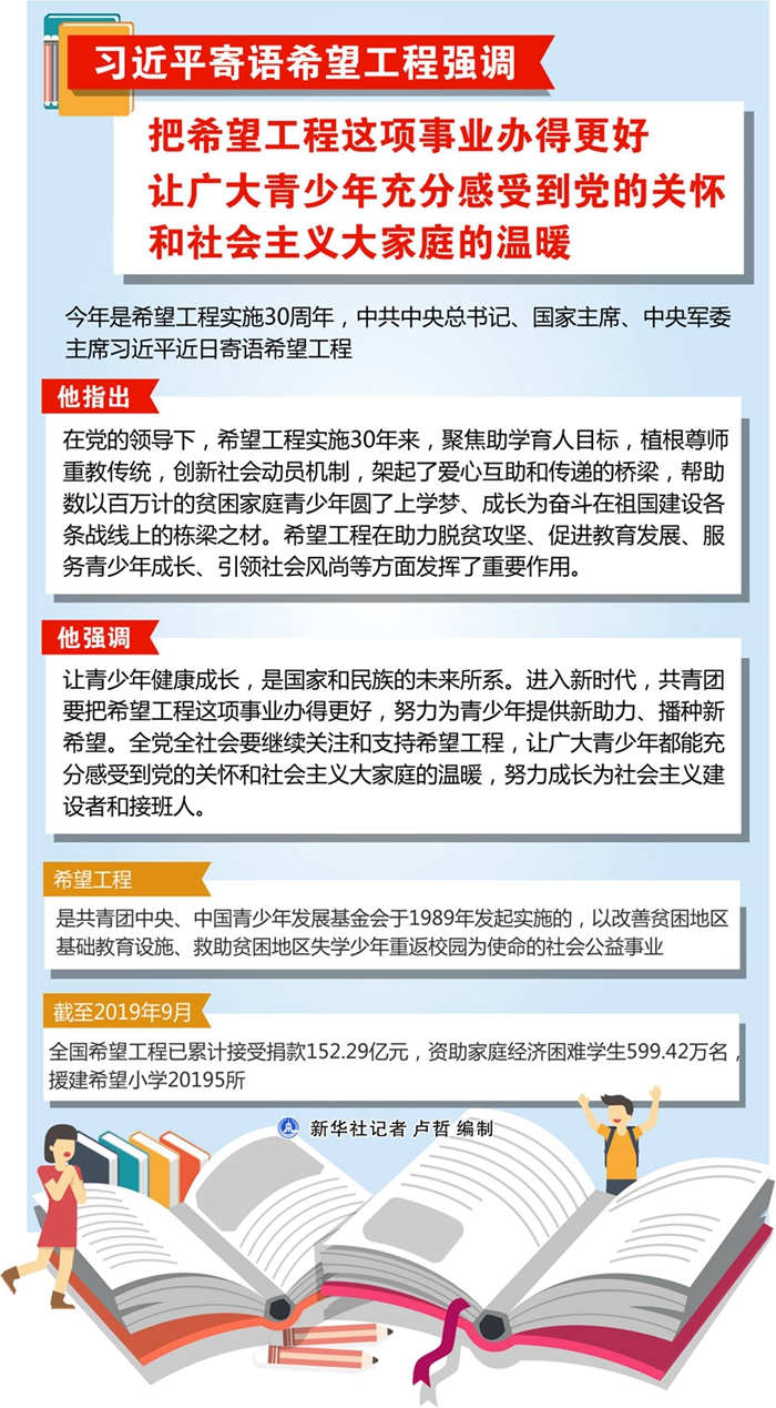 習(xí)近平強(qiáng)調(diào),讓青少年健康成長(zhǎng),是國(guó)家和民族的未來(lái)所系。進(jìn)入新時(shí)代,共青團(tuán)要把希望工程這項(xiàng)事業(yè)辦得更好,努力為青少年提供新助力、播種新希望。全黨全社會(huì)要繼續(xù)關(guān)注和支持希望工程,讓廣大青少年都能充分感受到黨的關(guān)懷和社會(huì)主義大家庭的溫暖,努力成長(zhǎng)為社會(huì)主義建設(shè)者和接班人。