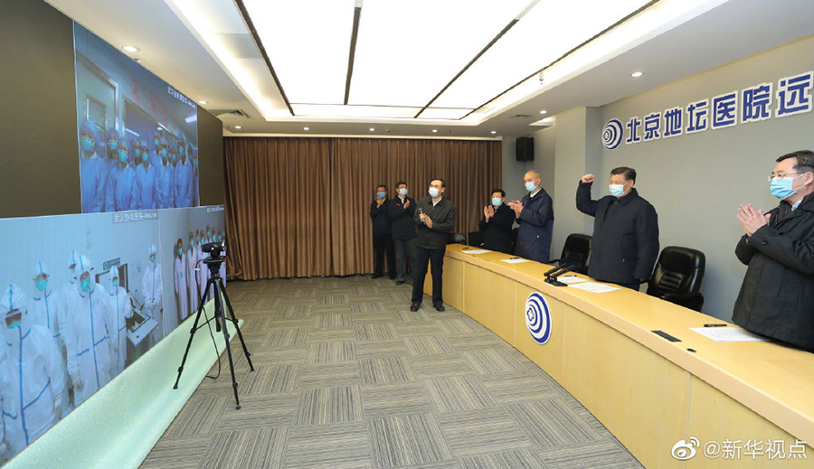 10日下午,習(xí)近平總書記在北京地壇醫(yī)院遠程診療中心,通過視頻連線武漢市收治新冠肺炎患者的金銀潭醫(yī)院、協(xié)和醫(yī)院、火神山醫(yī)院,稱贊奮戰(zhàn)在疫情防控一線的廣大醫(yī)務(wù)工作者、干部職工和人民解放軍指戰(zhàn)員是“火線上的中流砥柱”。習(xí)近平指出,當(dāng)前疫情防控工作正處在膠著對壘的緊要關(guān)頭,一定要堅持下去,堅決打贏湖北保衛(wèi)戰(zhàn)、武漢保衛(wèi)戰(zhàn)。武漢勝則湖北勝,湖北勝則全國勝。(文字記者張曉松 攝影記者:鞠鵬、謝環(huán)馳)