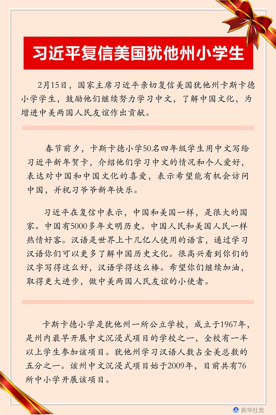 新華社北京2月22日電? 2月15日,國家主席習(xí)近平親切復(fù)信美國猶他州卡斯卡德小學(xué)學(xué)生,鼓勵(lì)他們繼續(xù)努力學(xué)習(xí)中文,了解中國文化,為增進(jìn)中美兩國人民友誼作出貢獻(xiàn)。