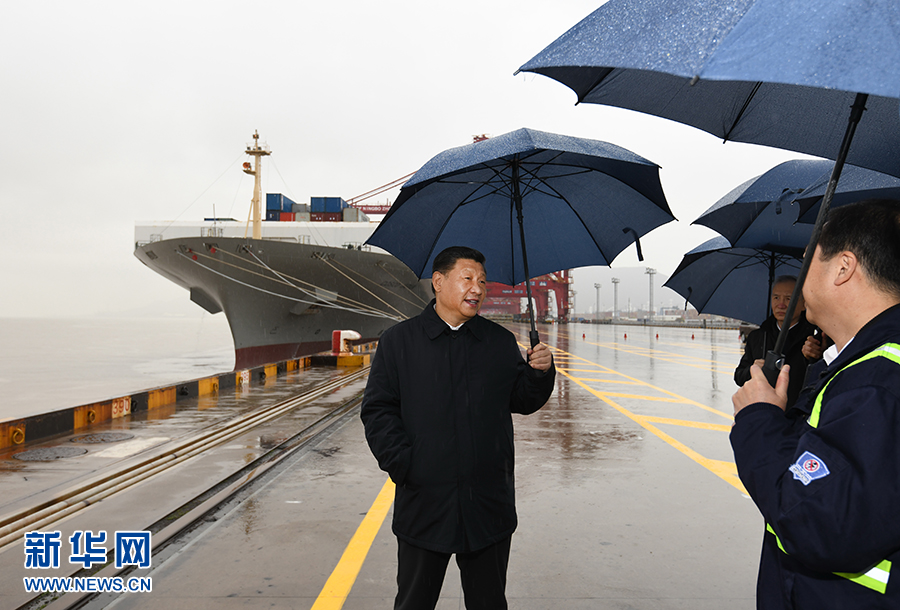 3月29日,中共中央總書(shū)記、國(guó)家主席、中央軍委主席習(xí)近平在浙江考察調(diào)研。這是習(xí)近平在寧波舟山港穿山港區(qū)碼頭了解港口復(fù)工復(fù)產(chǎn)情況。 新華社記者 申宏 攝