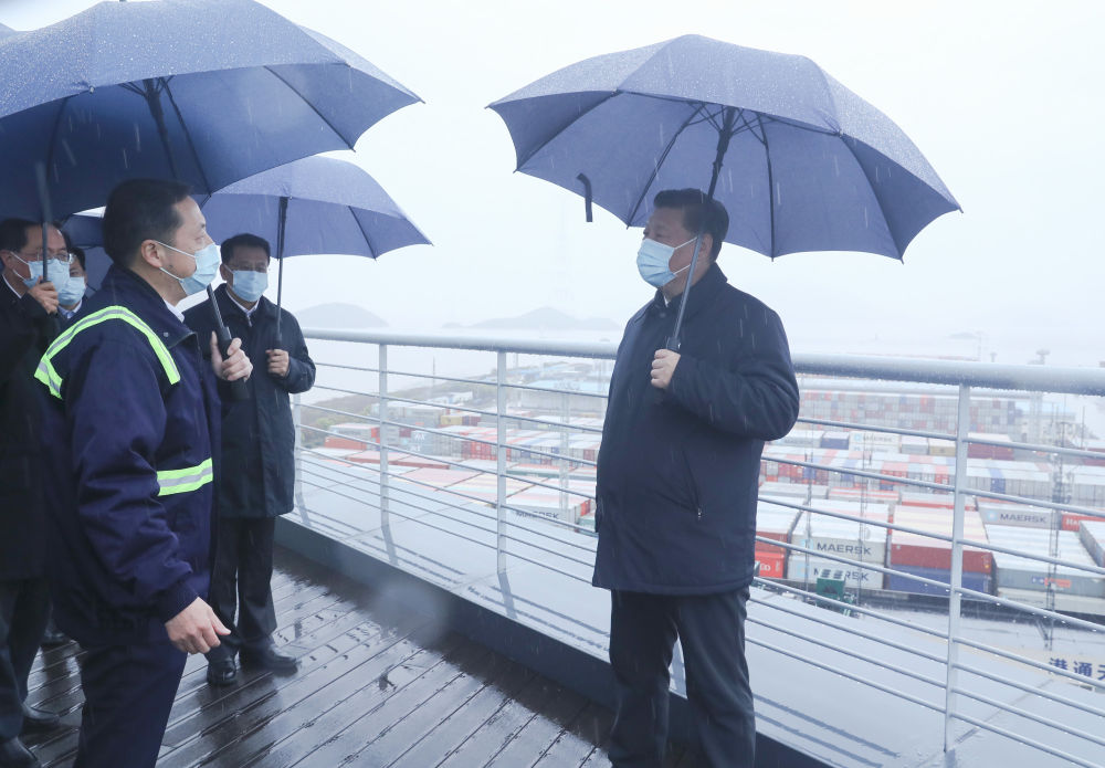 當(dāng)時,總書記正在穿山港區(qū)2號集裝箱泊位察看碼頭現(xiàn)場作業(yè)情況。海風(fēng)卷著細雨,空氣十分清新,周邊環(huán)境也很空曠,人員之間保持著比較大的距離?!?