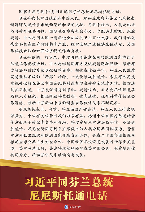 習近平強調,前不久,中方同包括芬方在內的歐洲國家舉行了防疫工作視頻會議。中方愿繼續(xù)同芬方交流疫情防控經(jīng)驗,幫助芬方解決當前防疫物資短缺等困難。相信在你領導下,芬蘭人民繼續(xù)發(fā)揚堅韌不拔的“西蘇”精神,一定能夠戰(zhàn)勝疫情。希望芬方高度重視并做好在芬蘭中國公民特別是留學生的安全保障工作。相信通過共同抗疫,中芬友誼將得到深化。疫情過后,雙方要盡快恢復各層級人員往來,挖掘釋放科技創(chuàng)新、信息通信、生命科學等領域合作潛能,推動中芬面向未來的新型合作伙伴關系不斷發(fā)展。
