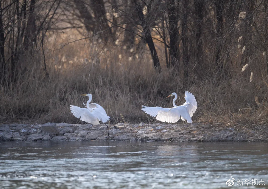 白鷺在汾河濕地公園內(nèi)嬉戲 新華社記者楊晨光攝
