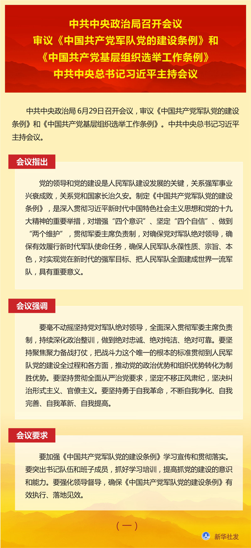 新華社北京6月29日電? 中共中央政治局6月29日召開會議,審議《中國共產(chǎn)黨軍隊黨的建設(shè)條例》和《中國共產(chǎn)黨基層組織選舉工作條例》。中共中央總書記習(xí)近平主持會議。