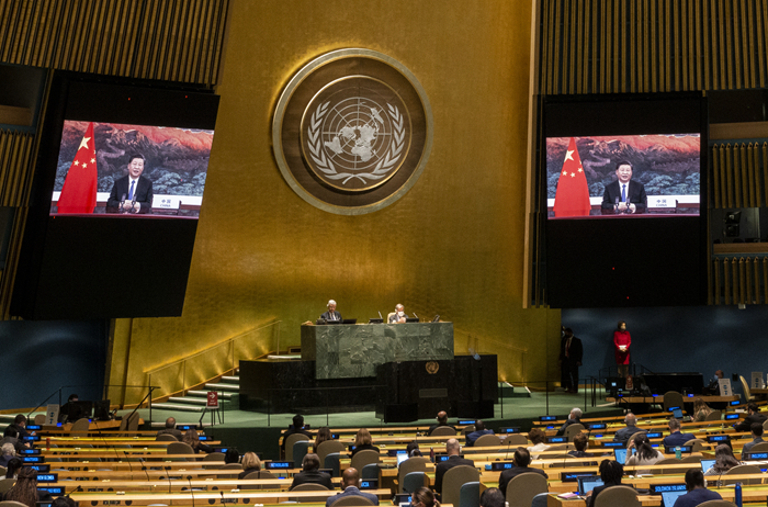 9月22日,國(guó)家主席習(xí)近平在第七十五屆聯(lián)合國(guó)大會(huì)一般性辯論上發(fā)表重要講話。新華社發(fā)(聯(lián)合國(guó)供圖/埃瑟金德爾·德貝貝 攝)