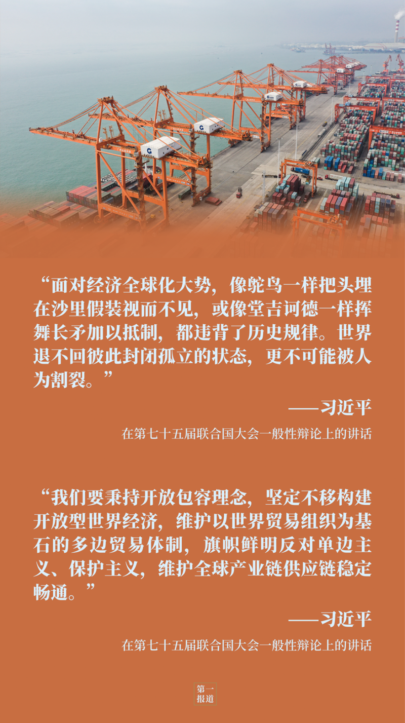 在聯(lián)合國“云講臺”,習主席還向國際社會生動闡釋了中國“新發(fā)展格局”與構(gòu)建開放型世界經(jīng)濟、推動全球經(jīng)濟復蘇的關系:“我們不追求一枝獨秀,不搞你輸我贏,也不會關起門來封閉運行,將逐步形成以國內(nèi)大循環(huán)為主體、國內(nèi)國際雙循環(huán)相互促進的新發(fā)展格局,為中國經(jīng)濟發(fā)展開辟空間,為世界經(jīng)濟復蘇和增長增添動力?!?/p>