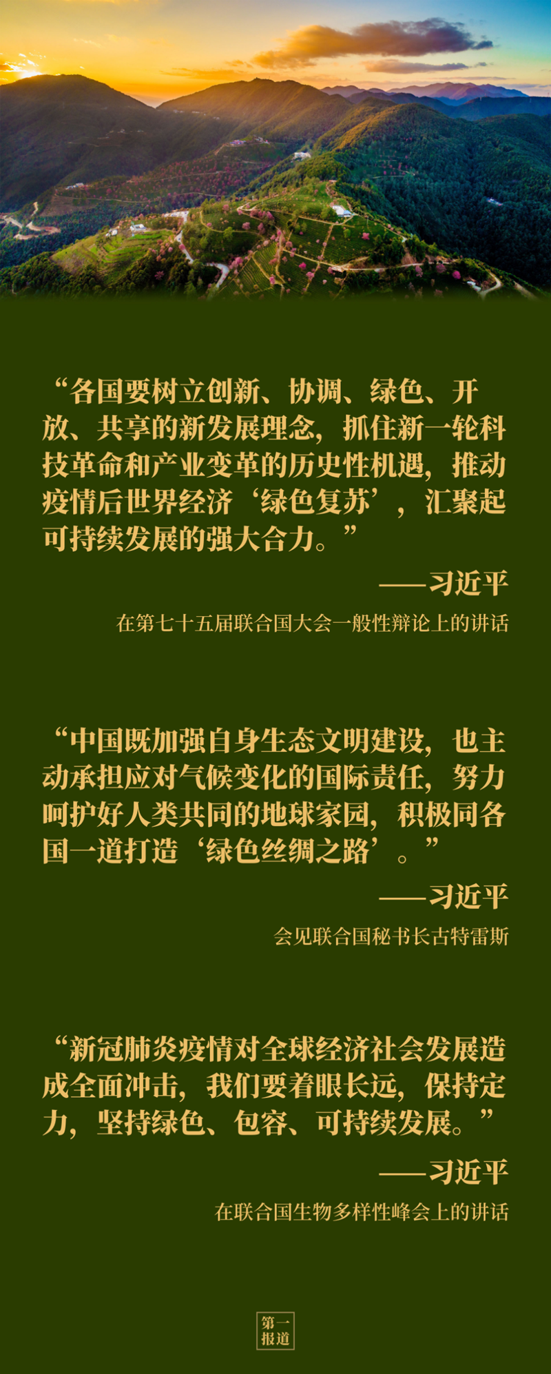 “創(chuàng)新、協(xié)調(diào)、綠色、開放、共享的新發(fā)展理念”“綠色復蘇”“綠色絲綢之路”……梳理習主席出席聯(lián)合國成立75周年系列高級別會議期間一系列重要論述,“綠色”是出現(xiàn)頻率最高的關鍵詞之一。